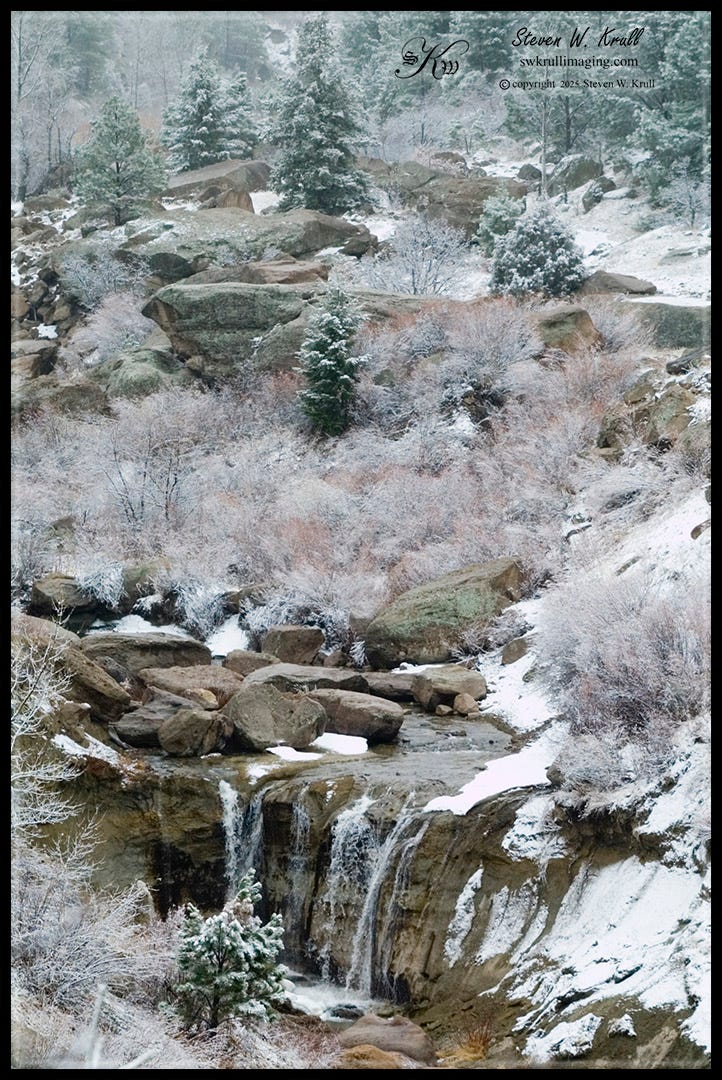Michelle was the first to awaken on Thanksgiving day, and took a deep breath to fill her nostrils with the aroma of a large turkey breast simmering in the crock pot. She noticed that the water in the pot had boiled down a bit overnight, and added a pint before pouring a cup of coffee into her insulated mug. “Wow, what a gloomy morning,” she thought to herself as she went to sit down at the kitchen table. As she took her first sip, a quick glance out the big window revealed the season’s first snowflakes slowly drifting through the pine trees on the eastern ledge of beautiful Castlewood Canyon State Park. For a second she felt a twinge of loneliness as she thought of her mom so far away in her home town of Gardiner., Montana. Growing up, most of her Thanksgiving mornings were spent helping her mom get the cafe ready for visitors and locals without close family to celebrate with.